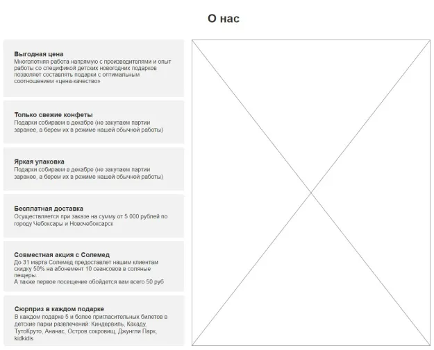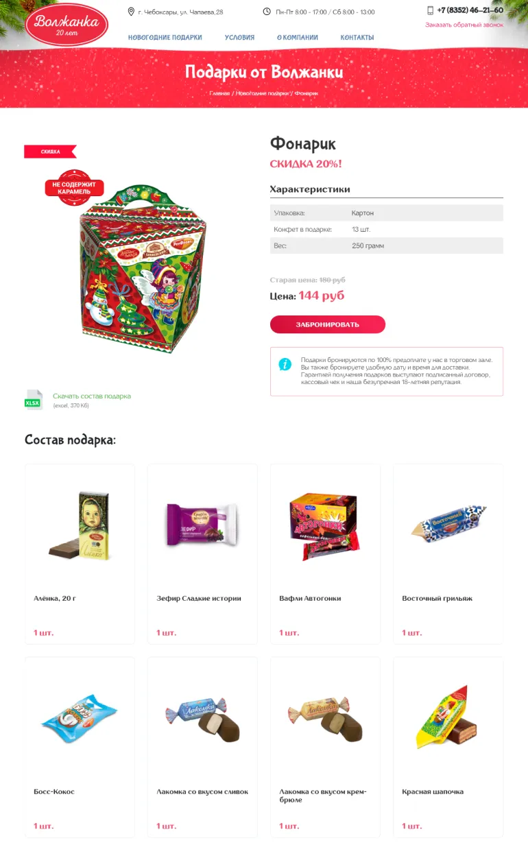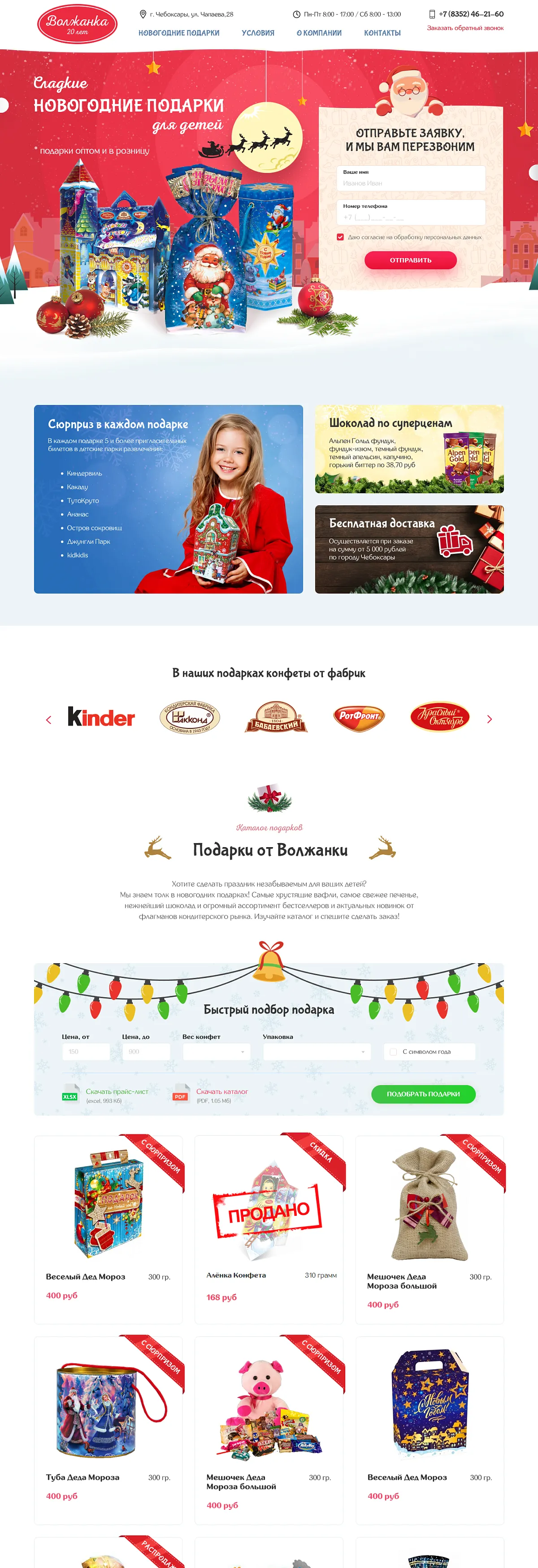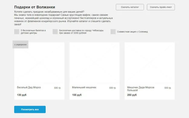 При посещении сайта пользователи сразу видят дополнительные опции компании «Волжанка»: бесплатную доставку, подарочные билеты в детские центры и блок для формирования подарка по индивидуальному заказу. Далее разместили конфигуратор быстрого подбора подарков и перечень всех новогодних наборов в наличии. Чтобы сориентироваться в ассортименте и подобрать наиболее подходящий подарок, пользователю необходимо только ввести ценовой диапазон и желаемый вес подарка. Чтобы подробно ознакомиться с содержимым подарка, нужно кликнуть по карточке товара.