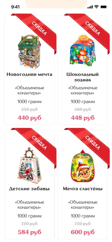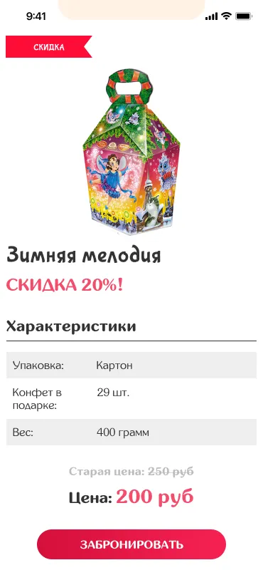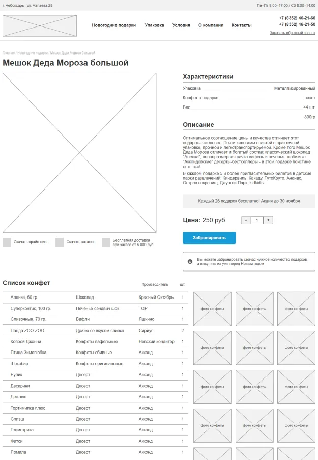 2. К карточкам товара добавить максимально полную информацию о составе подарков: фото, наименование и количество конфет, общий вес и упаковка