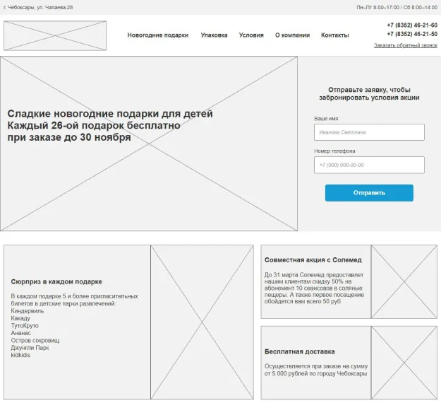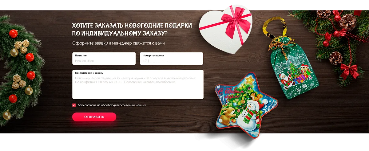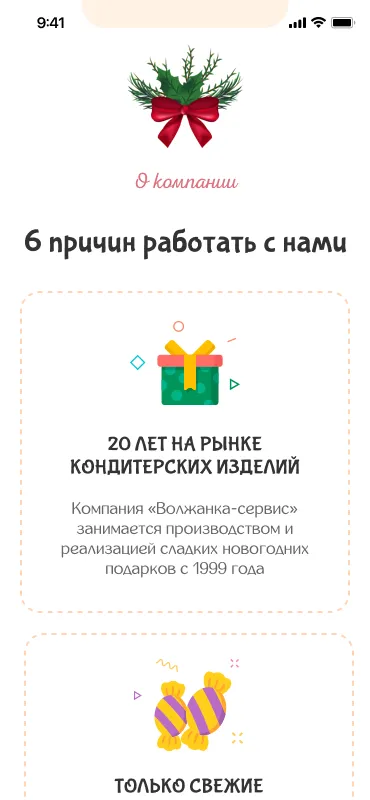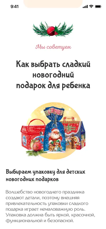 Стояла задача создать сайт для подбора новогодних подарков, поэтому тематика оформления страниц изначально была понятной. Важно было выдержать баланс между яркими праздничными изображениями и карточками товаров. Не хотелось перенасыщать страницы иллюстрациями елочных игрушек, снежинок и другой новогодней атрибутики. Это отвлекало бы посетителей сайта от главного – подарочных наборов клиента.